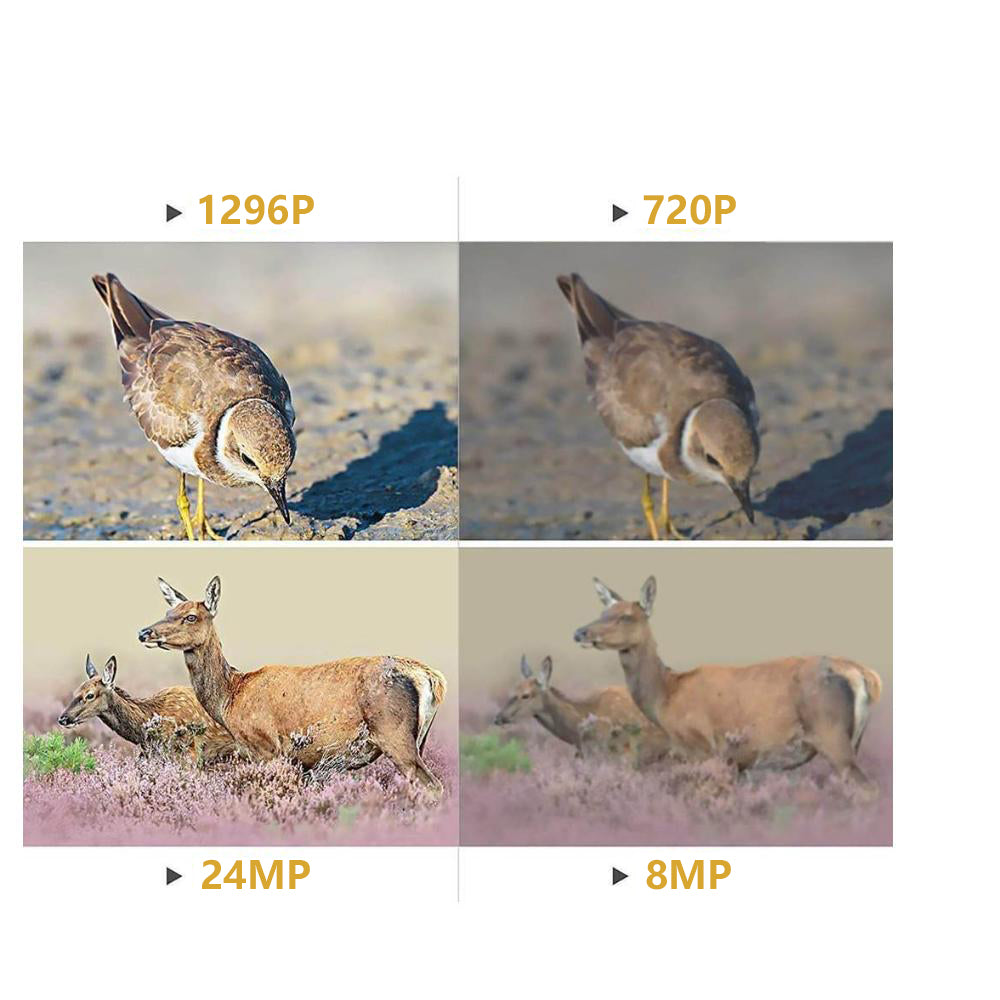 Captura imágenes de hasta 24MP y 1296P de video cuando se detecta movimiento (monocromo de noche). Seleccione la resolución deseada para las fotos de 2 a 24 megapíxeles y la resolución de vídeo (píxeles por fotograma). Una resolución más alta produce fotos de mejor calidad, pero crea archivos más grandes que aprovechan mejor la memoria de la tarjeta SD.